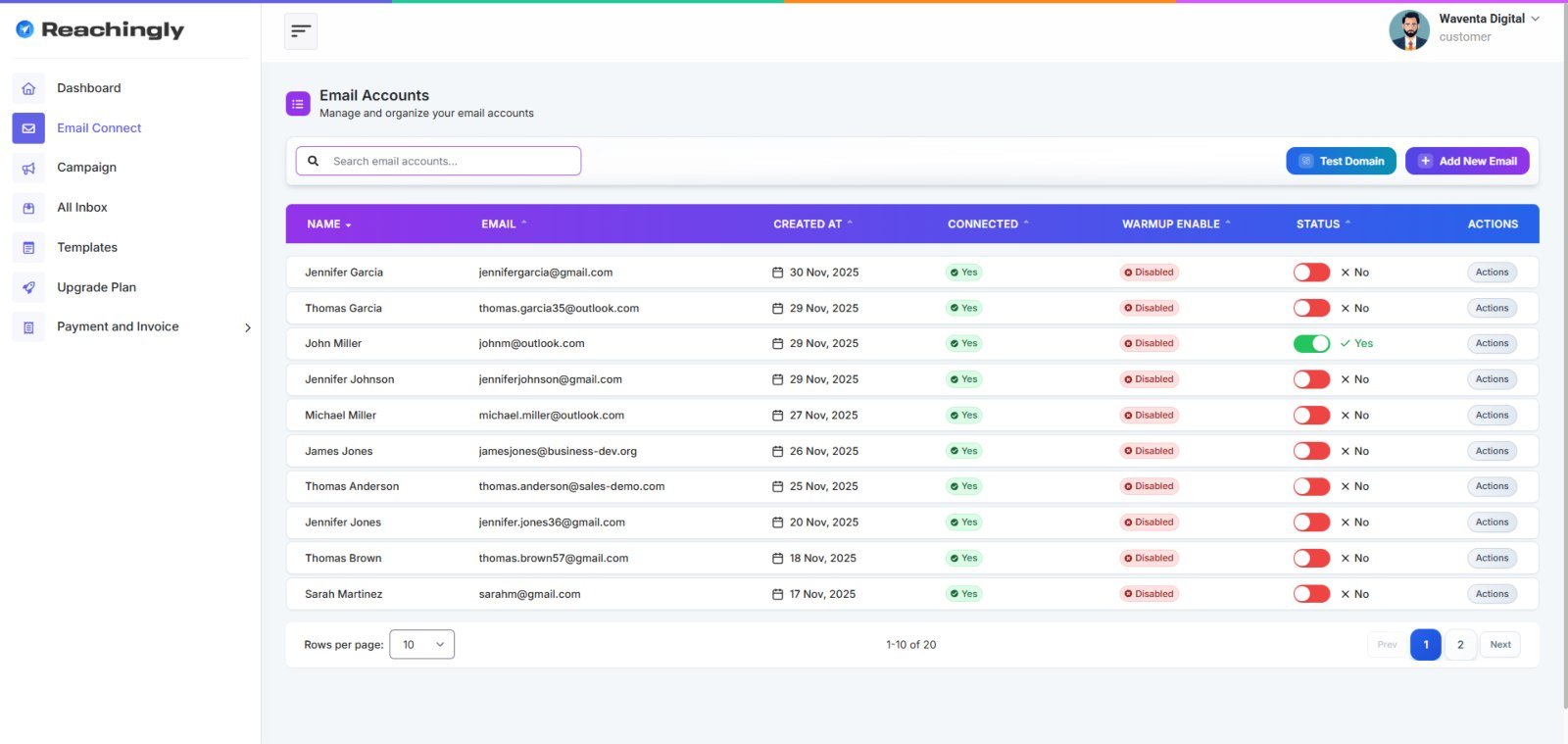 Connect unlimited email addresses to Reachingly and automatically rotate sending across inboxes. The more accounts you add, the more emails you can send and the more qualified prospects you can reach in less time.