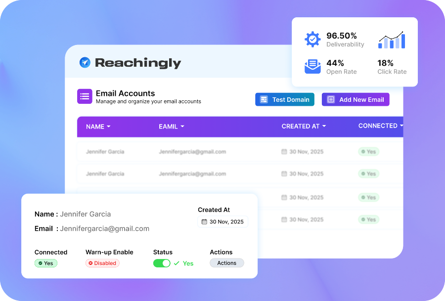 Reachingly helps you detect and fix deliverability issues early so your emails remain compliant, consistent, and inbox-ready. Scale outreach with confidence, knowing your campaigns are built to avoid spam filters and support long-term sending performance.