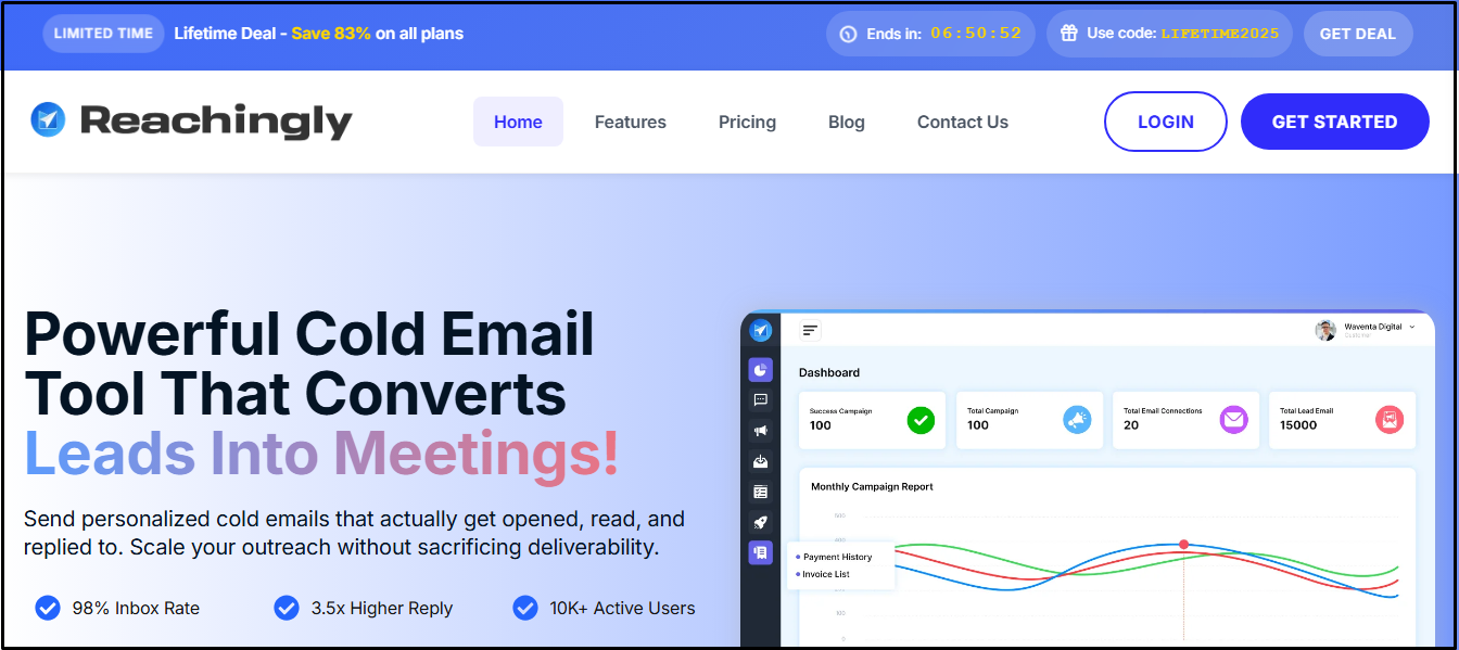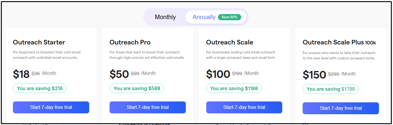 Reachingly positions itself as a more budget-friendly option, especially for agencies and startups. Annual plans are priced competitively, often starting lower than comparable Saleshandy tiers while including advanced personalization and analytics features.